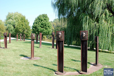 公園沿路盡是綠樹跟草地,綠色植物真的會使人心情平靜,一向對 "草的味道" 鍾情的我,趁著草坪剛被除草機駛過一回,用力地吸了好多口氣,一路感受那屬於綠色的香氣,我想我的肺應該很開心,聞到最後竟然覺得自己有點微醺,而藝術品 則穿插在草地及林間,可以隨地坐在自己喜歡的作品前細細欣賞,猶如一座開放的藝廊,這樣的感覺其實還蠻幸福的。當然小女這個時候也派上用場了,我們把沿路 景色記錄下來,請大家欣賞一下。