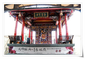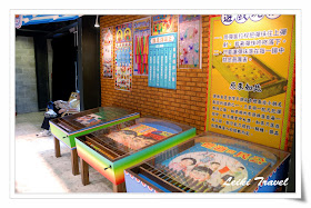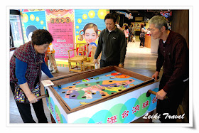 最重要的是,普通門票才台票 150,真的很俗,因為裡面除了有傳統古厝和廟宇參觀外,在各大戲台和場地還有不定期的表演和展覽,我們就剛好碰上在曲藝館的崑曲表演、吳卿的金雕展和大鼓隊舞獅表演,在傳習教室裡頭也有定期的說書和童玩比賽,光是嘉慶君遊台的滾珠台,就讓我們全家玩得笑翻了,那是一個印上嘉慶君遊台時的台灣地名滾珠台,需要兩人聯手將大彈珠滾到洞裡去,雖然叮噹跟老姐小時候搶電視,長大後卻是默契絕佳,不論是阿猴、打狗還是雞籠,可都是一次進洞。