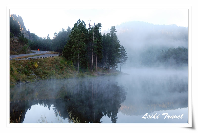 沿著244號公路繼續開,四位總統臉上映著晨光,也目送了我們好一陣子,除了Black Hills的特色針石(Needles)沿路陪著我們,一個轉彎處馬賊湖(Horse Thief Lake)出現了,湖後是一片山景樹林,湖上瀰漫著一圈清晨的霧氣,中國山水畫的悠悠意境就這麼活生生地呈現在我們的眼前,這種天生寧靜的美不需要解說,就足以觸動人心。