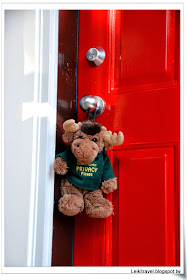 拿了房間鑰匙,開車從辦公室旁石子鋪的車道過去,抵達我們房間那一棟木屋,車位就在該棟木屋旁邊,木屋後面是彷彿小鹿斑比隨時會探出頭來的一片樹林,開了喜氣的大紅門,裡頭總共有兩間房間,是長型的結構。