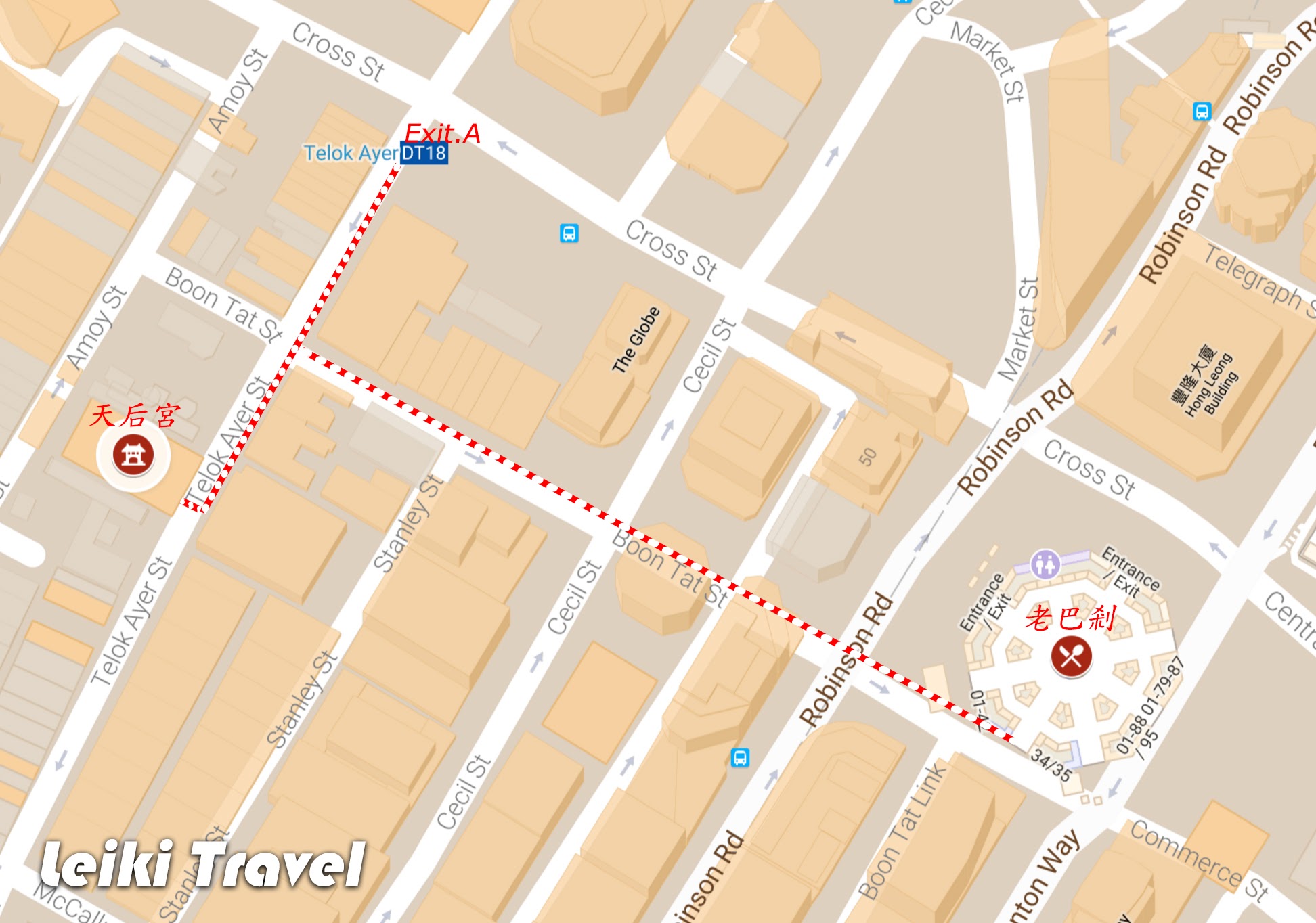 - 老巴剎熟食中心 出口過街至 AIA Tower,沿 Robinson Rd. 朝南走約 500 公尺