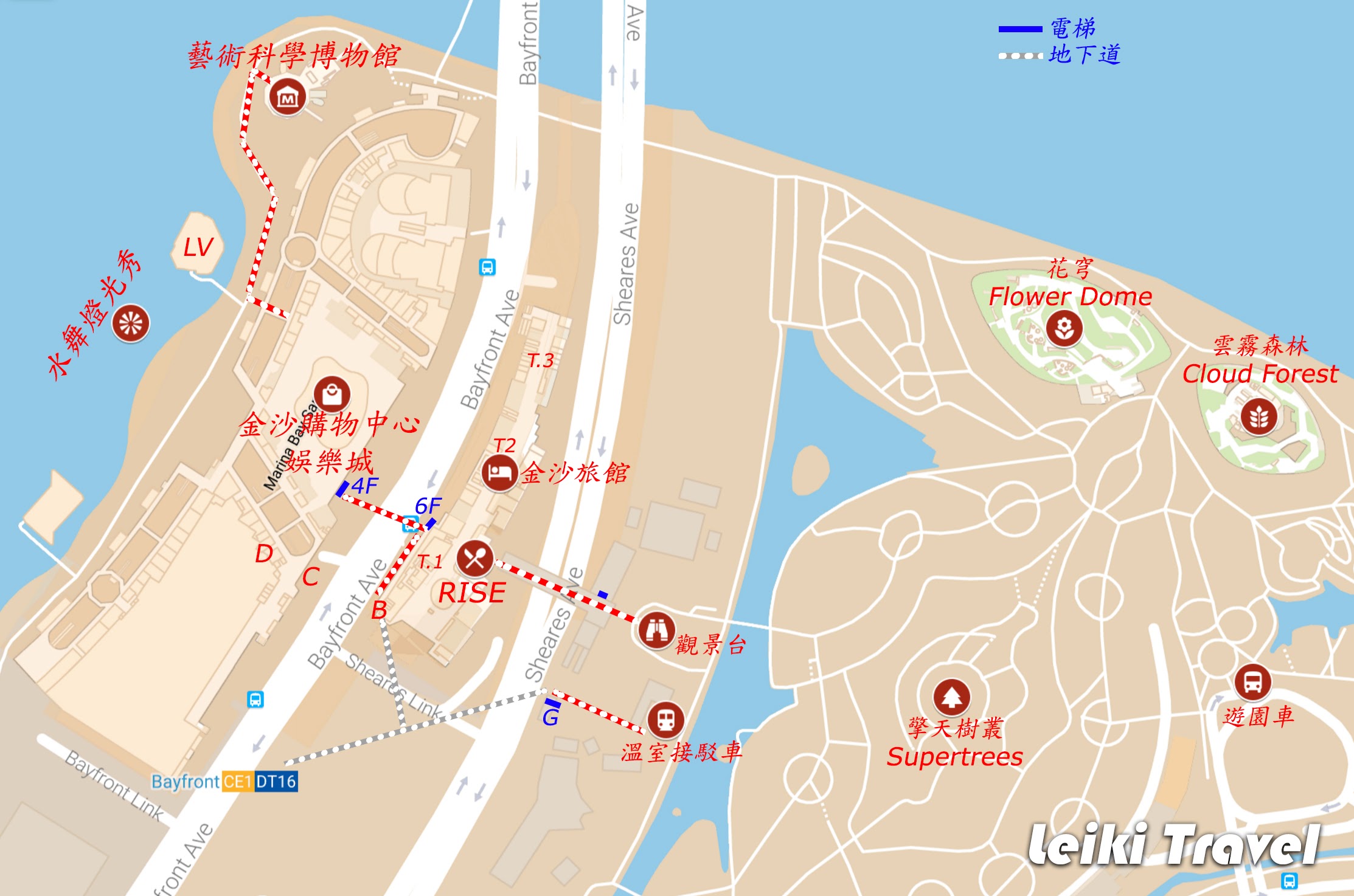 往娛樂城方向 -- 上至 Bay Level -- 往 Chanel 出門口 -- 右轉沿海濱人行道 - DT18 直落亚逸(Telok Ayer) 具民族色彩老建築街區轉成高樓大廈金融區