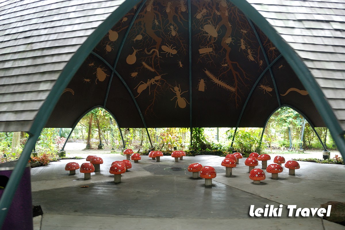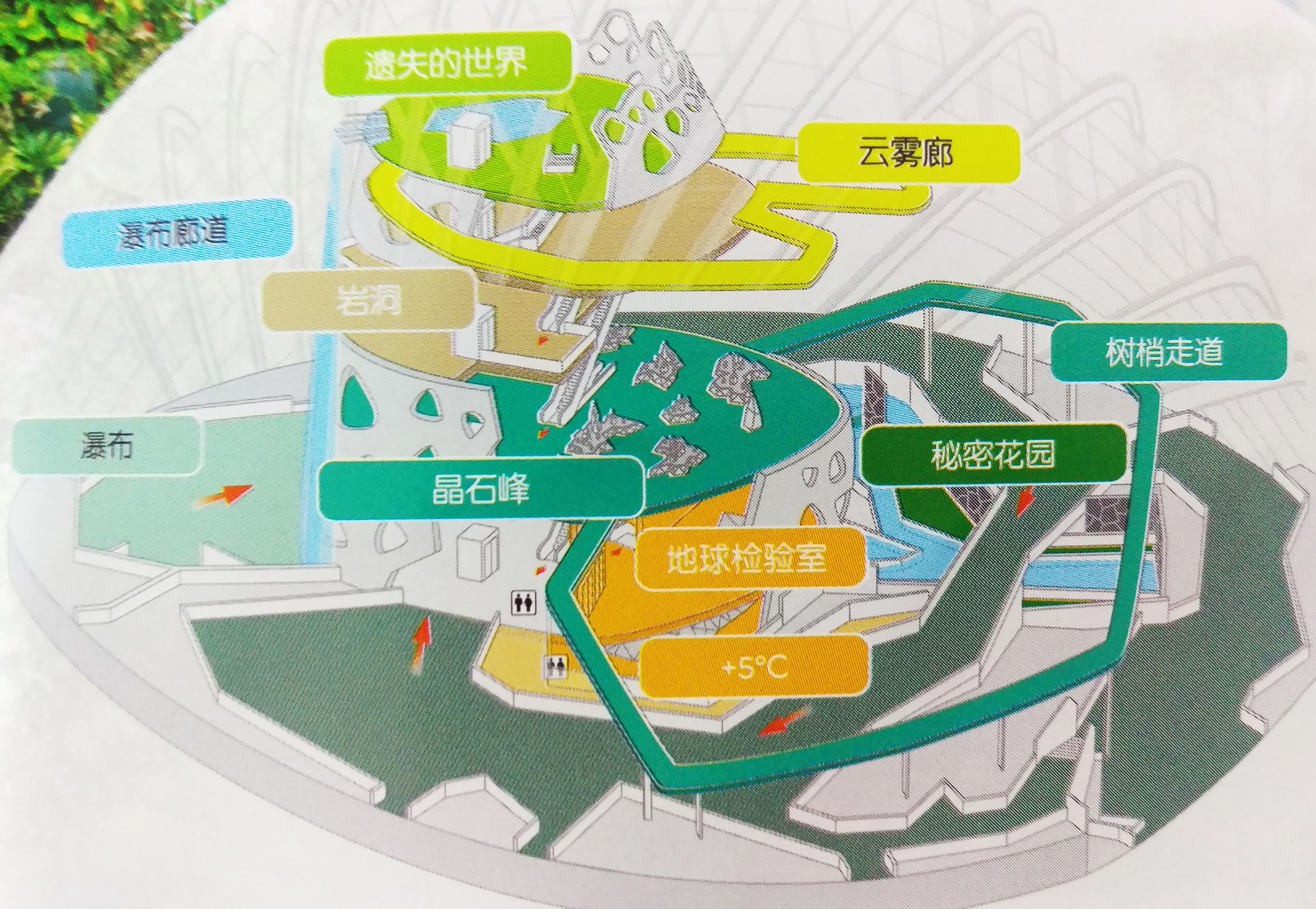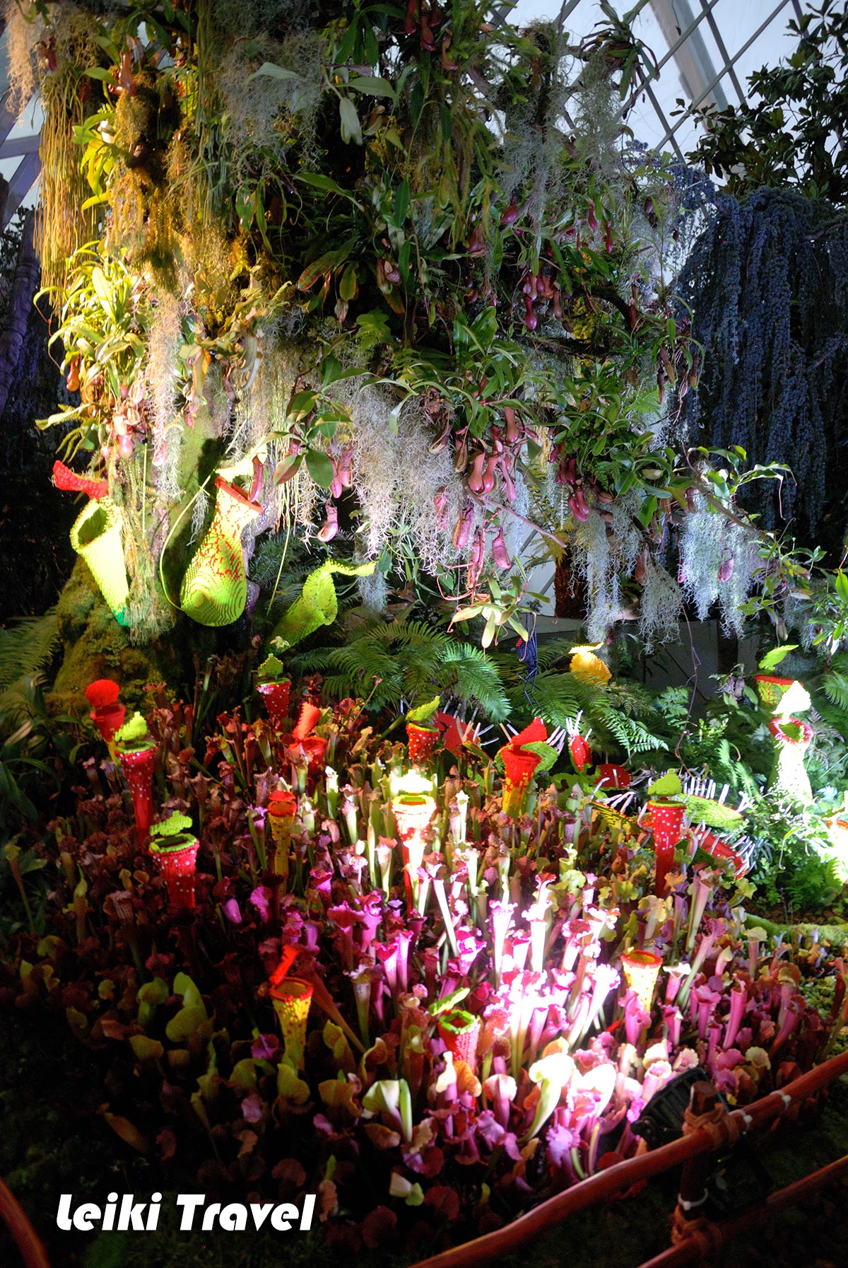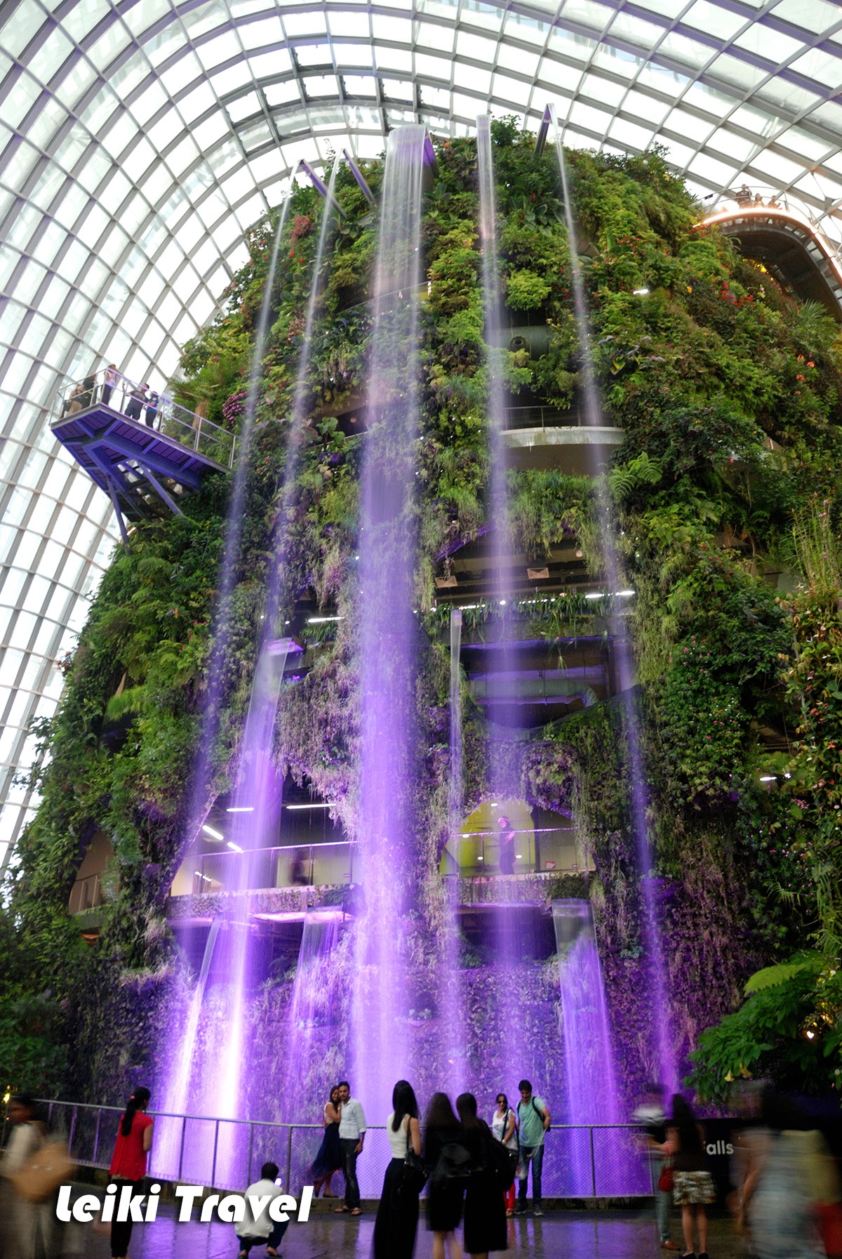 一進門,眼鏡就一片霧茫茫,溫室主題是潮濕的熱帶山區,擦亮眼鏡映入眼簾的是 35 公尺高的紫色瀑布,想當然是人造的,還可以見到頂端的水管,但底下燈光紅光、紫光交互變換,瀑布前成了情侶們的最佳拍照點。